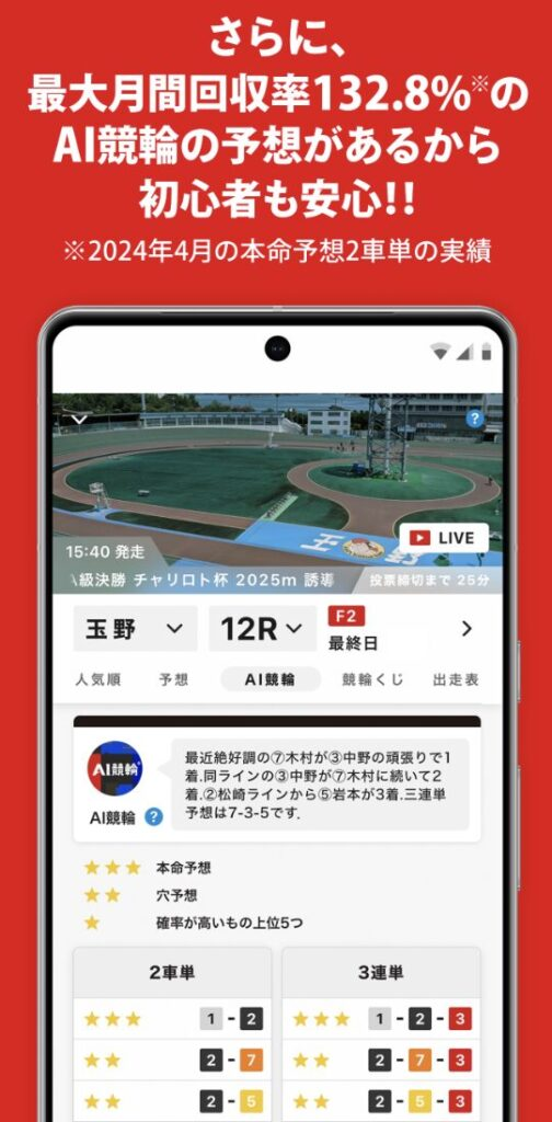 - 情報収集から投票、観戦までコレ一つ:予想紙の閲覧、AI予想の確認、ライブ映像の視聴、車券の購入、払戻金の受け取りまで、すべてがアプリ内で完結します。